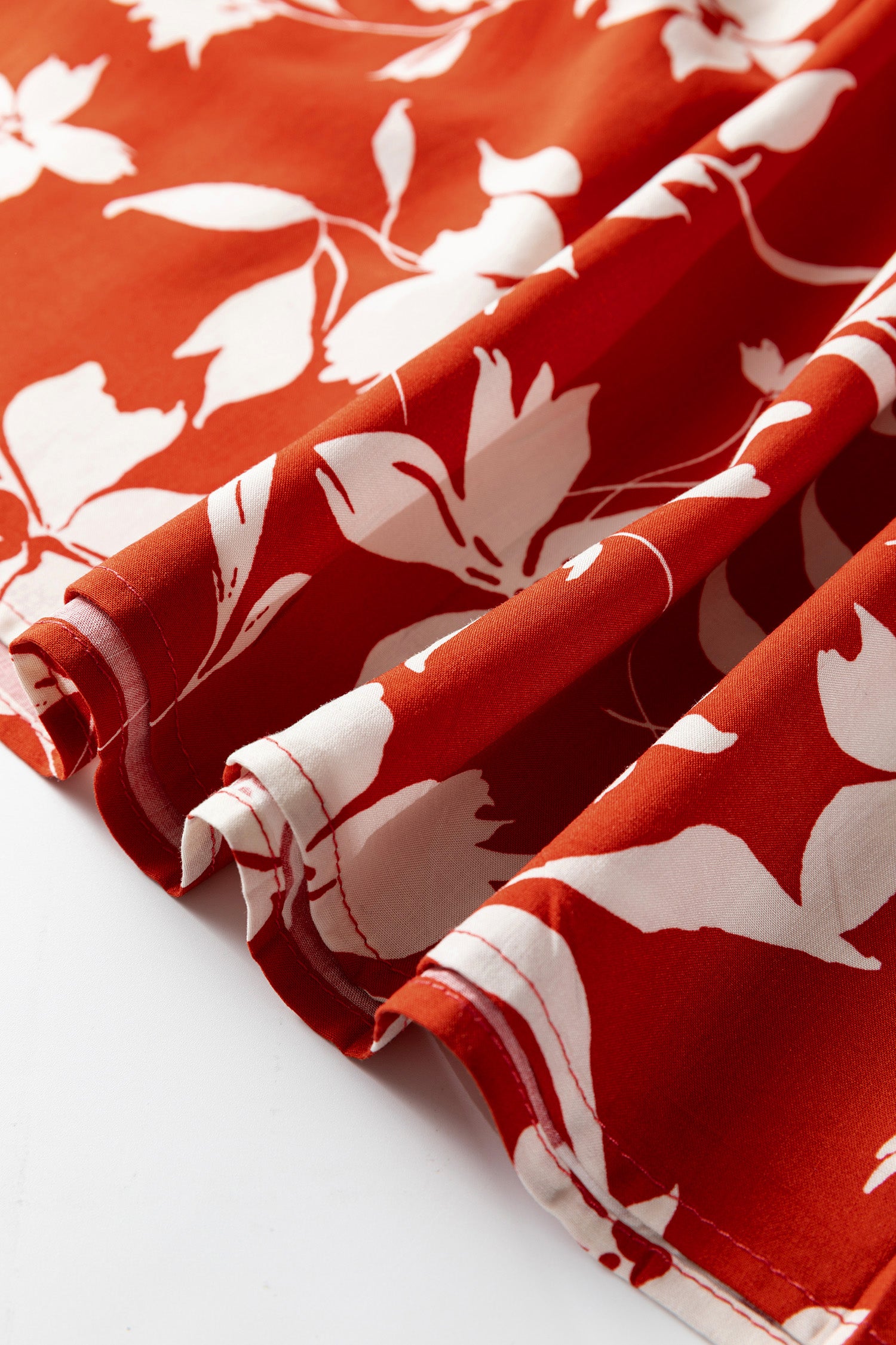 Red Boho Floral Print Lettuce Trim 3/4 Sleeve Mini Dress